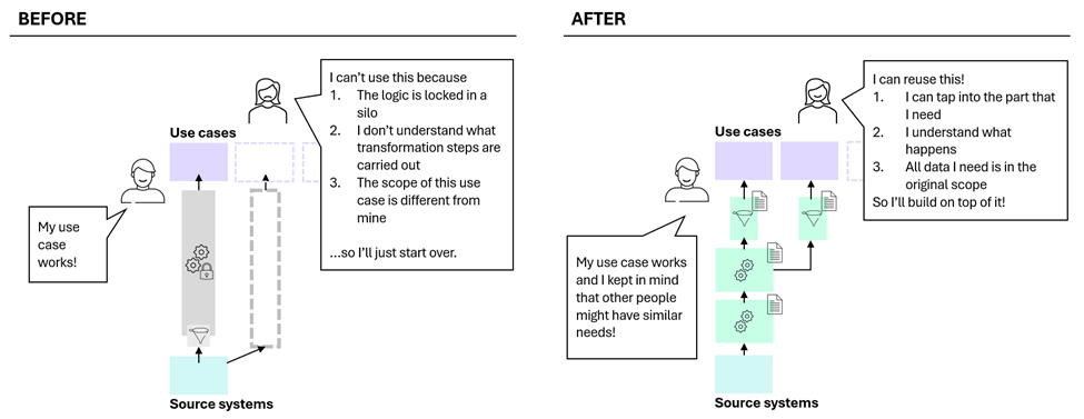 • Reduces future rework by aligning outputs with real consumption needs upfront, making data products easier to extend and scale.